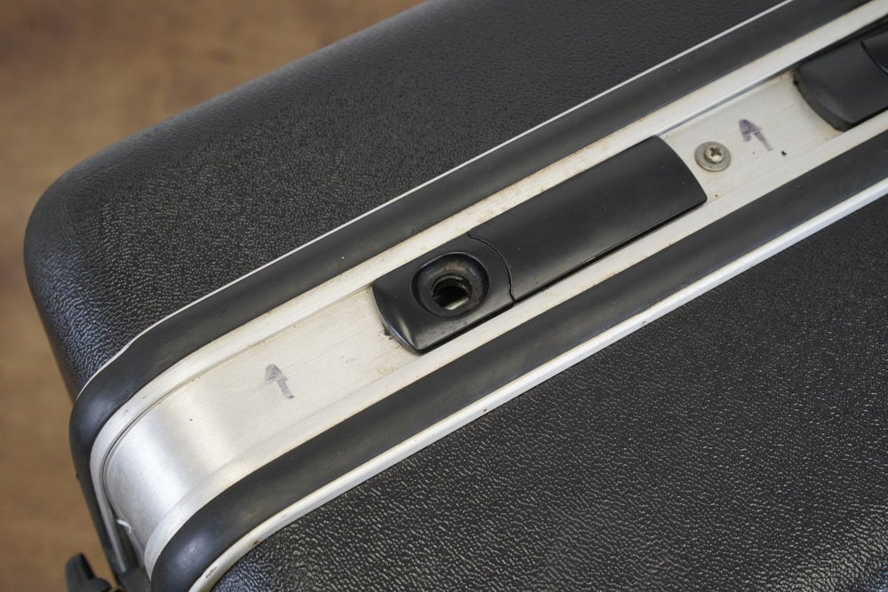 Mechanic's notes: Cosmetic paint peel on the frame by the seatpost clamp, minor paint imperfections, minor chain drop, headset bearings require service or replacement, one lock is missing on the transport case